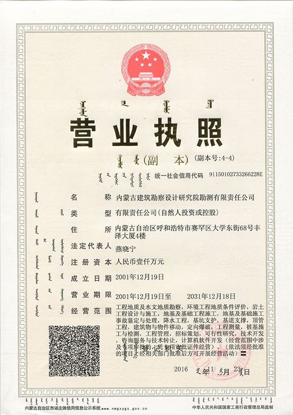 • 內蒙古建筑勘察設計研究院勘測有限責任公司,是全國首家完成 轉企建制的省級建筑勘察設計單位。公司前身為內蒙古建筑勘察 設計研究院勘測分院, 成立于1954年 ,經過六十多年的發展, 現已成為全區技術力量雄厚、專業設置齊全的集巖土工程勘察 、 設計、治理、檢測、監理、咨詢、水文地質勘查、工程測量、科 研為一體的綜合性企業 ... ... [查看詳情]